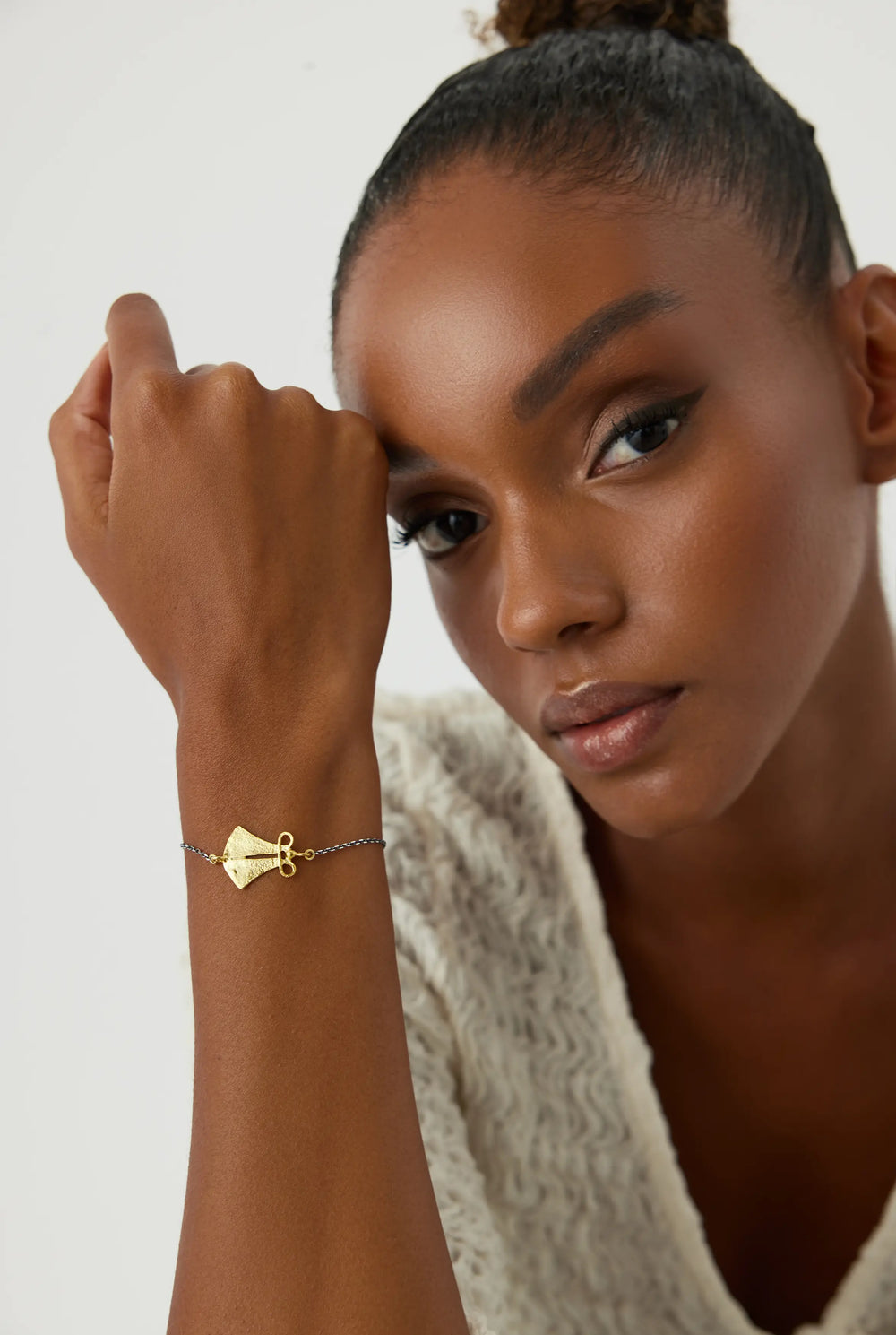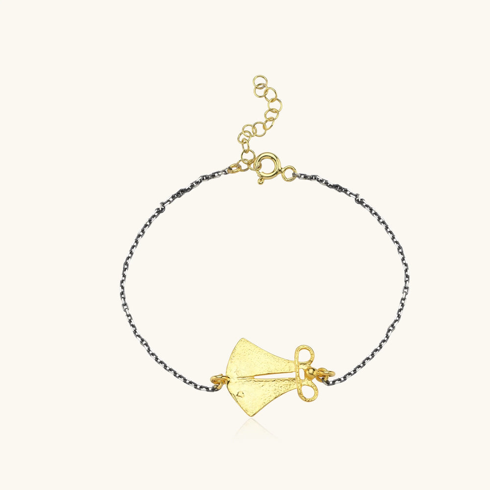 This captivating bracelet features a sword figure inspired by ancient times. Crafted from 18K gold-plated oxidized sterling silver, this piece embodies a design that carries the traces of time, evoking a touch of history. The sword shape symbolizes courage, strength, and determination, making this bracelet both stylish and meaningful.