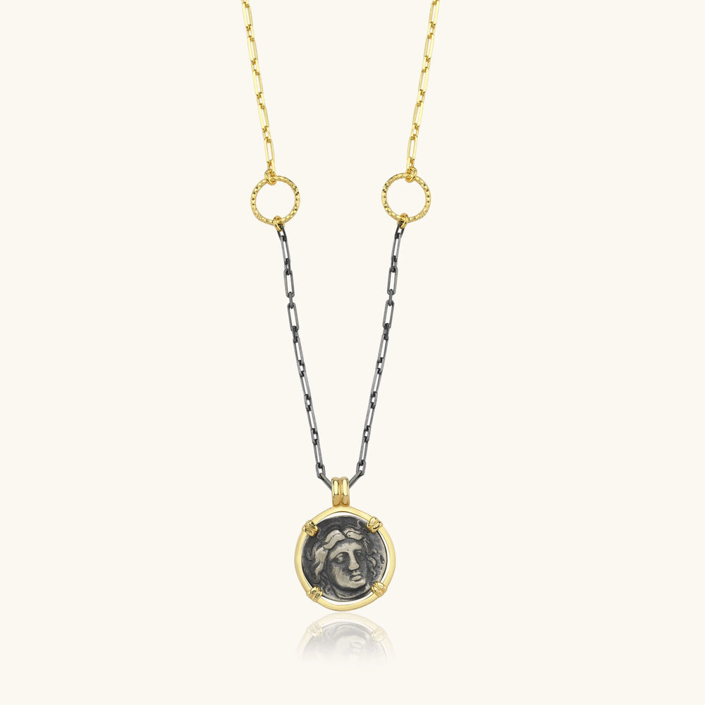 Embrace the timeless elegance of history with this exquisite Ancient Coin Necklace. Crafted from 18K gold-plated sterling silver, this necklace features a beautifully detailed coin pendant that evokes the allure of ancient civilizations. The two-tone design, with a blackened silver chain and gold accents, adds a contemporary twist to this classic piece, making it perfect for both everyday wear and special occasions.