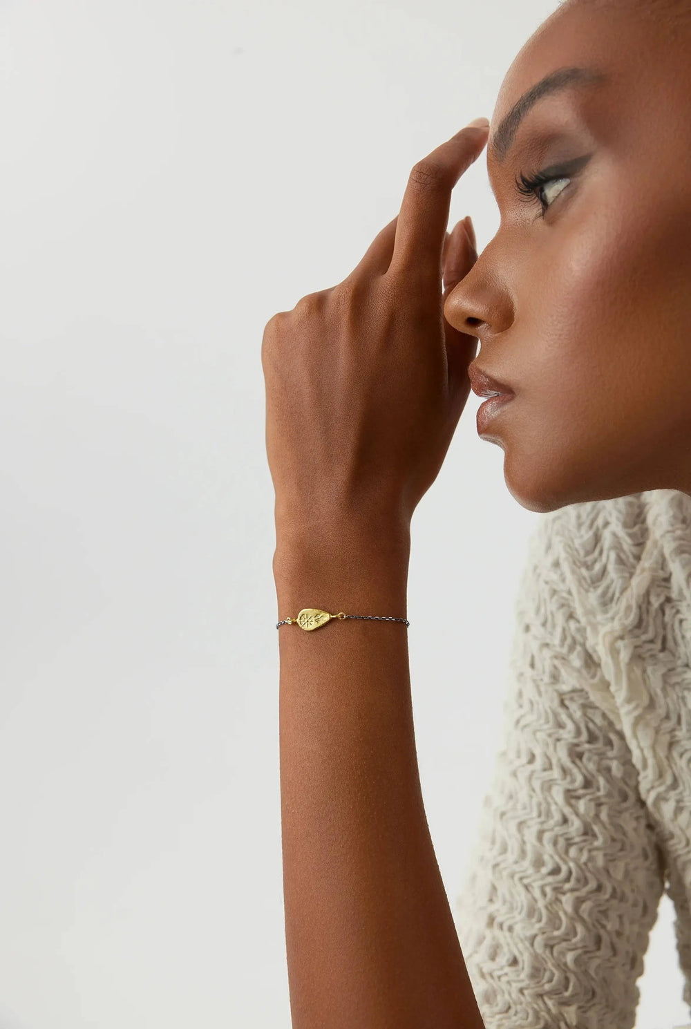 This exquisite bracelet features a miniature sword figure, inspired by the powerful symbols of ancient times. Crafted from 18K gold-plated oxidized sterling silver, this bracelet captures the essence of history and courage in its intricate design. The sword figure, representing strength, determination, and protection, makes this piece not only a stylish accessory but also a meaningful one.