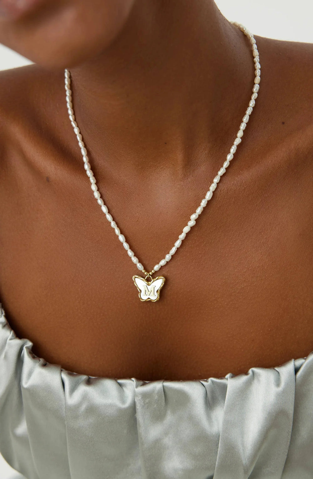 Celebrate elegance and personalization with our Butterfly Initial Pendant Necklace, featuring a stunning combination of luxurious pearls and a gold-plated butterfly pendant. This exquisite necklace is crafted from high-quality 925 Sterling Silver and adorned with a beautifully detailed butterfly charm that showcases your chosen initial. The strand of lustrous freshwater pearls adds a touch of sophistication, making this necklace a perfect choice for those who appreciate personalized and elegant jewelry.