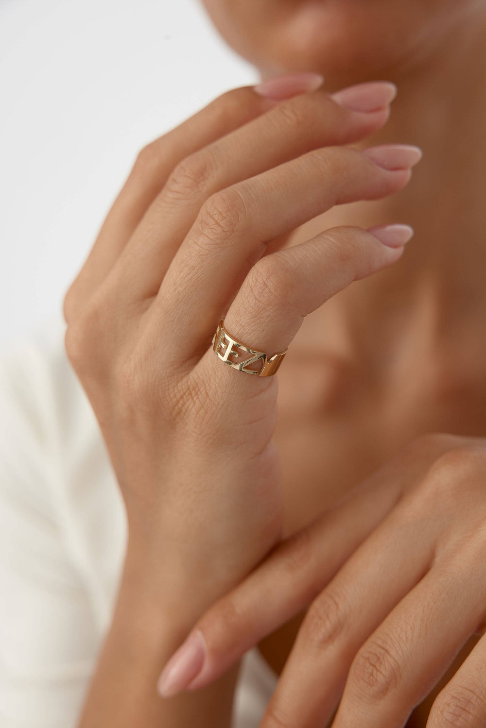 Make a bold statement with this Custom Name Ring. Crafted from high-quality 925K sterling silver and plated with 18K gold, this ring features a personalized cut-out name design that adds a unique touch to any look. Its sleek and modern style makes it perfect for everyday wear, adding a personalized charm to your jewelry collection.