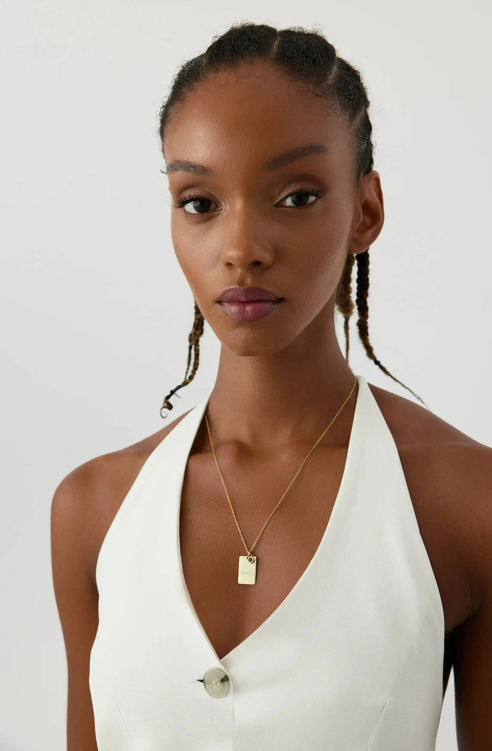 Personalized Gold Name Necklace, Custom Engraved Rectangular Pendant with Birthstone Charm