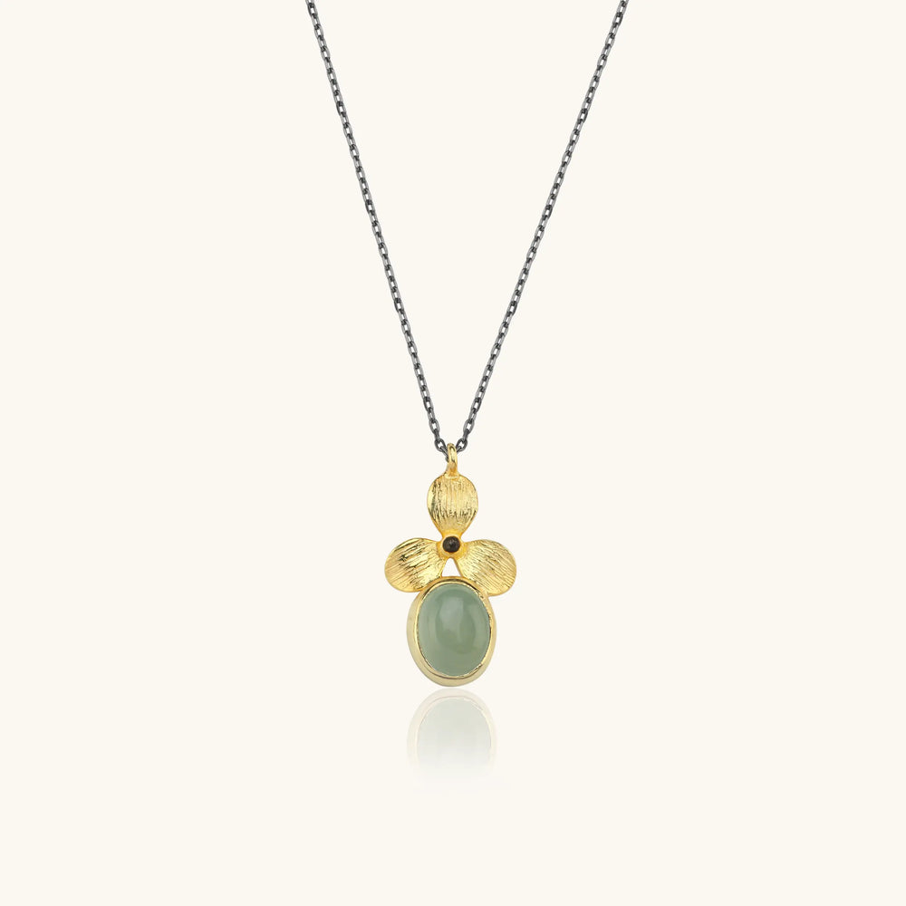 Embrace the serene beauty of nature with this exquisite Green Chalcedony and Gold Orchid Pendant Necklace. Crafted from 18K gold-plated sterling silver, this necklace features a delicately designed orchid pendant adorned with a soft green chalcedony gemstone. The pendant's gold-plated petals are finely textured, creating a beautiful contrast with the smooth, oval green chalcedony stone. The piece is finished with an oxidized sterling silver chain, adding a touch of rustic elegance.