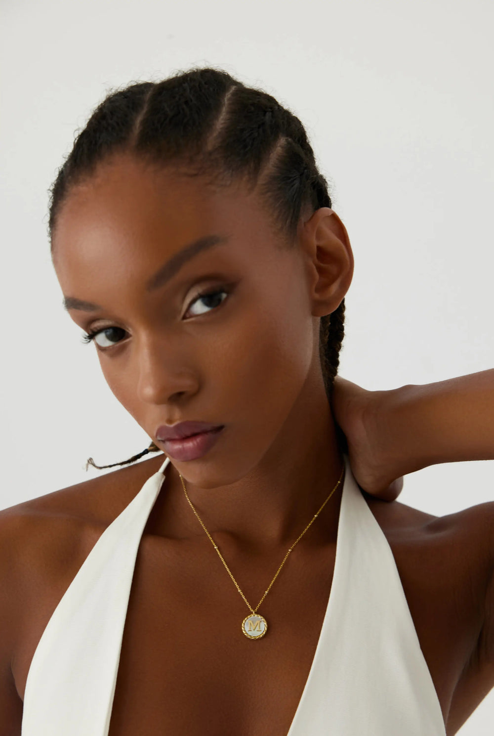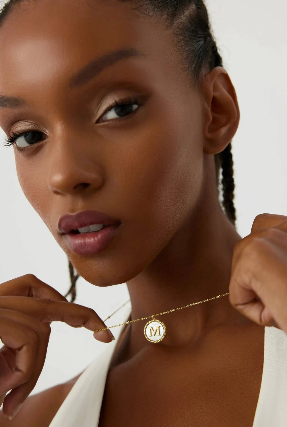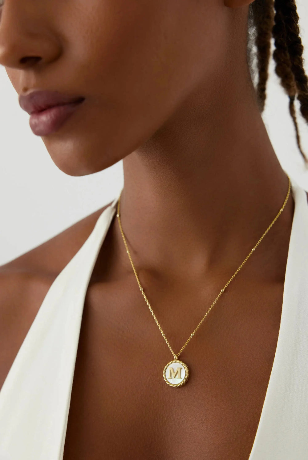 Add a touch of elegance and personalization to your jewelry collection with this exquisite Mother of Pearl Initial Necklace. Featuring a lustrous mother of pearl disc encased in a stunning 18K gold-plated sterling silver setting, this piece showcases your chosen initial, making it a meaningful and stylish accessory for any occasion.