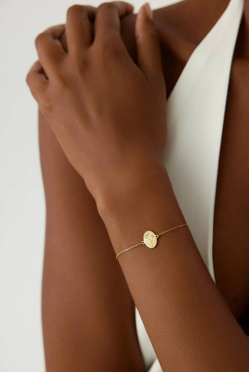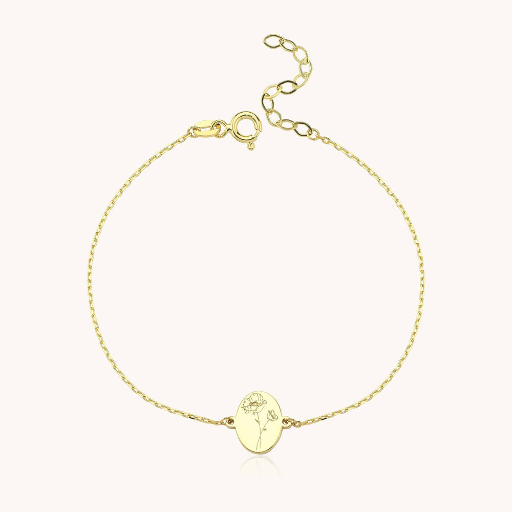 This exquisite Birth Flower Bracelet is a perfect blend of personalization and elegance. Crafted from high-quality 18K gold-plated sterling silver, this delicate bracelet features an oval charm engraved with a beautiful birth flower, making it a unique and meaningful piece. The minimalist design makes it versatile for everyday wear, whether solo or layered with other bracelets.